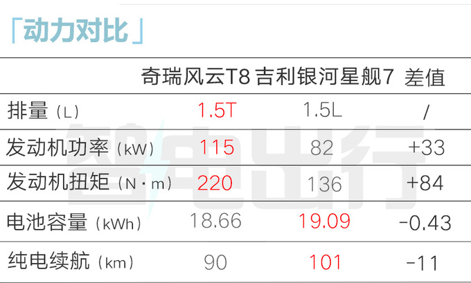 风云T8搭载1.5T插电混动系统,1.5T发动机最大功率115kW,配备18.46kWh和18.66kWh磷酸铁锂电池,纯电续航里程均90km,综合油耗均5.19L/100km。