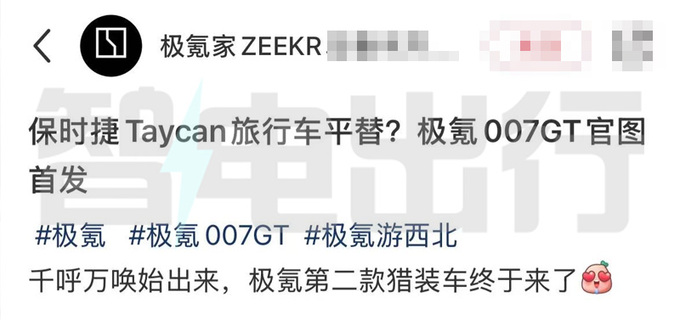 极氪发布了旗下第2款猎装车007GT的预告图,并配文:一场伟大的旅行即将开启,明天见。极氪家销售表示,007GT是保时捷Taycan旅行车的平替。