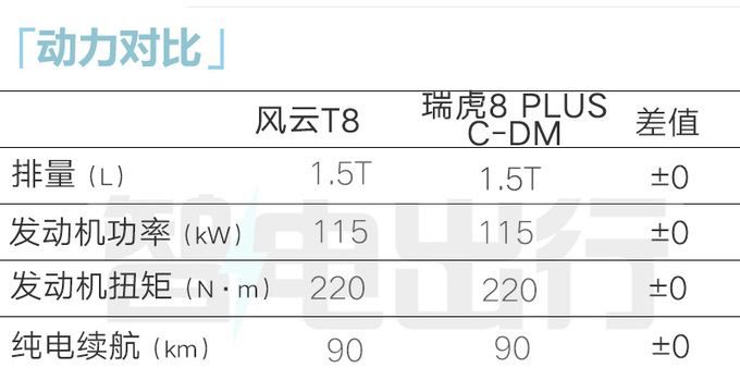 风云T8搭载1.5T插电混动系统,发动机最大功率115kW,配备18.66kWh磷酸铁锂电池,纯电续航里程90km,综合油耗5.19L/100km。