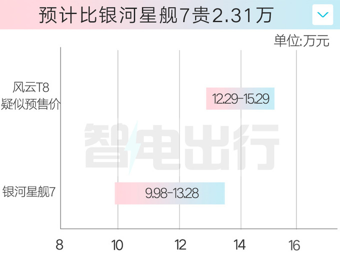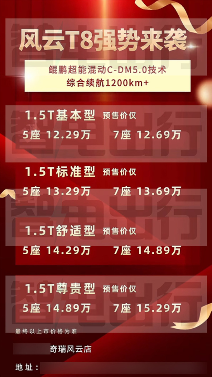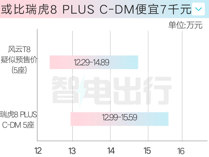 奇瑞风云T8将于1月11日开启预售,经销商提前曝光了其预售价,5座版卖12.29万-14.89万元,7座版卖12.69万-15.29万元。新车前脸设计和瑞虎8 PLUS C-DM相似,且宽、高和轴距与后者完全相同。