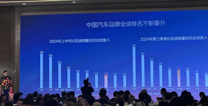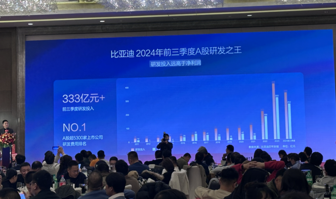 在2025年1月9日于北京举办的比亚迪“新春家宴”现场,近三百家经销商、媒体齐聚现场。比亚迪官方再次从全年业绩、全球市场表现特别是研发投入方面强化了其全球新能源车领导者的地位:2024年前三季度比亚迪在研发上以“远高于净利润”的研发投入(333亿元人民币以上),超越了全部A股5,300家上市公司成为“A股研发投入NO.1”!