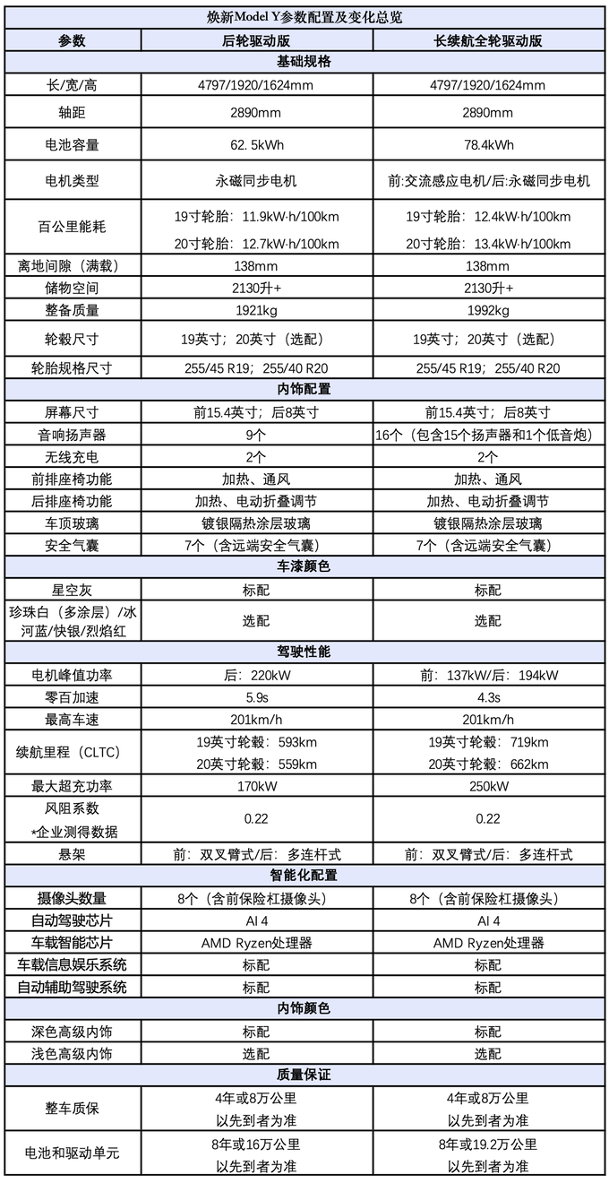 特斯拉Model Y焕新版后轮驱动版电池容量为62.5kWh,CLTC续航里程593公里,电机最大功率为220千瓦,0-100km/h加速时间为5.9秒;长续航全轮驱动版电池容量为78.4kWh,CLTC续航里程719公里,前后电机功率分别为137千瓦和194千瓦,0-100km/h加速时间为4.3秒。