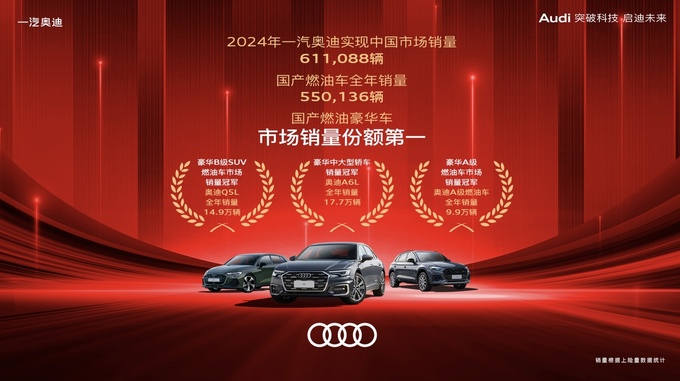 在刚刚过去的2024年,一汽奥迪凭借其深厚的市场底蕴和前瞻性的战略眼光,在豪华车市场中取得了显著成绩。全年累计整车销量达到611088辆,其中,国产燃油车销量为550136辆,实现了在复杂市场环境下的逆势增长,并稳固了其在国产燃油豪华车市场的领先位置。这一成就的取得,源于一汽奥迪多年深耕中国市场的积累,以及其“56789”稳健体系实力的支撑。