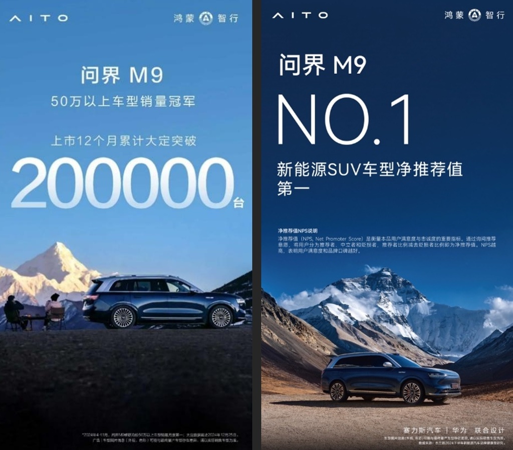 问界M9发布12个月累计大定已经突破20万辆,连续9个月中国市场50万以上月度销冠,短短12个月,问界M9单车交付数量也达到了15万辆。消费者用行动表达了对问界M9的认可和支持,更有很多社会名流和公众人物成为问界M9用户,并自发向亲友分享用车心得,鼓励购买,“野生销售员”成为问界M9用户社群的一道独特风景。杰兰路2024新能源汽车品牌健康度报告显示,问界M9以88.4的NPS高分,荣获新能源SUV车型净推荐值第一。过去一年,问界M9还陆续获得了“地平线杯”世界十佳智能汽车、“2024轩辕年度十佳汽车”、微博“年度最具心智车型”等荣誉奖项。