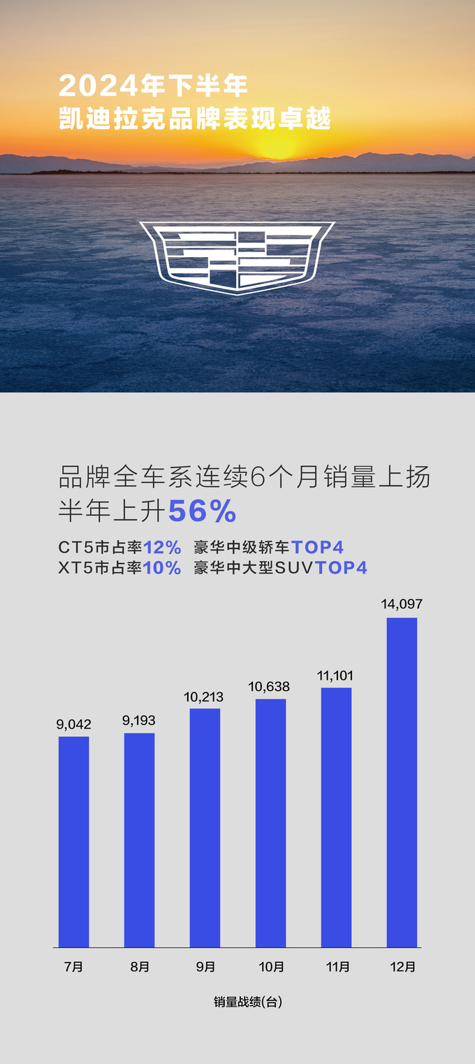 豪华品牌方面,2024年凯迪拉克品牌迎来跨越式发展,全年累计销量将近13万辆,同样连续6个月增长,半年销量激增56%。其中全新XT5表现最为抢眼,上市3个月累计大定超2万,已交付超1.5万辆。中高配车型占比超六成,终端成交价超奥迪Q5L和宝马X3。