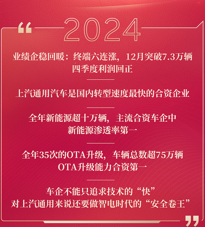 在刚刚过去的2024年,车圈主打一个“难”字,卷的“惨不忍睹”,老牌合资车企的日子尤其不好过。岁末年初各家都在总结2024的不容易与得失,用几家欢喜几家愁来形容最为贴切。总体来看,真正能欢喜起来的并不多,上汽通用汽车属于笑到了最后,在关键的第四季度,利润已经回正,成为2024国内转型最快的合资车企。“2025,向好向新”!