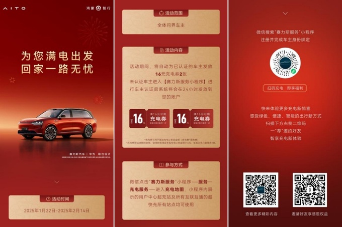就比如在2024年春节期间,问界推出了“为您满电出发,回家一路无忧”活动,向车主免费派发充电券?;疃奔浯?月22日持续至2月14日,所有认证用户均可领取两张价值16元的充电券,用于抵扣充电费和服务费。这一举措让广大车主在春节期间享受到实实在在的补能优惠。