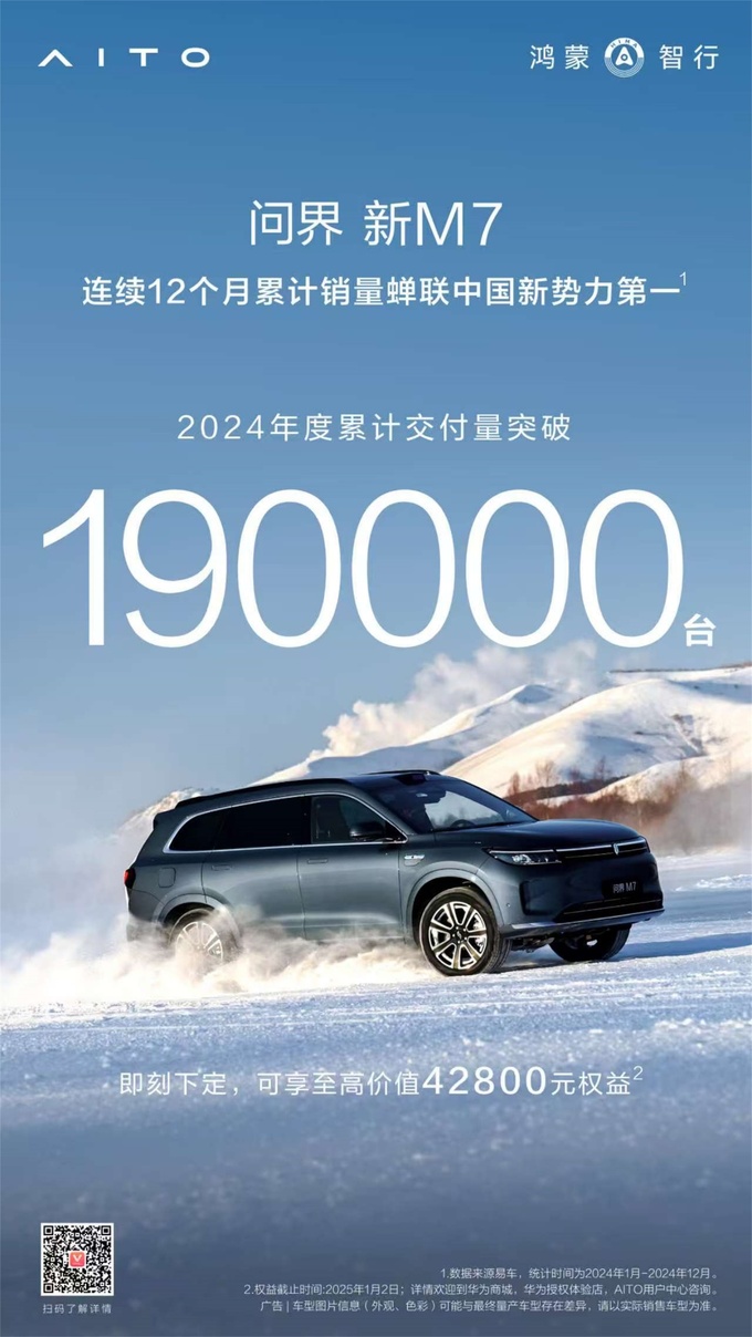 作为中国新能源汽车高端化的标杆之作,问界 M9不仅在春晚的舞台上大放异彩,同时在市场端也取得了亮眼成绩。上市12个月内,问界M9便完成了累计大定突破了20万辆的壮举,成为50万元以上新能源车型细分市场的佼佼者;而新M7则凭借其出色的性价比和智能化配置,连续多月在中国新能源品牌中占据销量榜首位置。这些成绩,不仅是消费者对问界产品力的高度认可,也证明了问界在新能源汽车领域快速崛起的影响力。