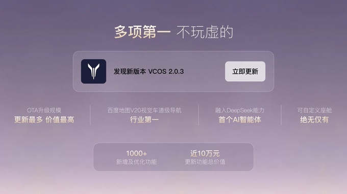 第一最,行业迄今最大规模的OTA升级:新增及优化功能超1000项,涵盖导航、语音、生态、系统桌面、智能体验等多个???;
