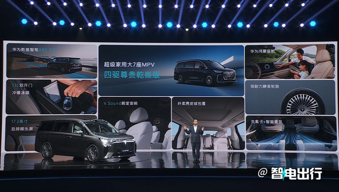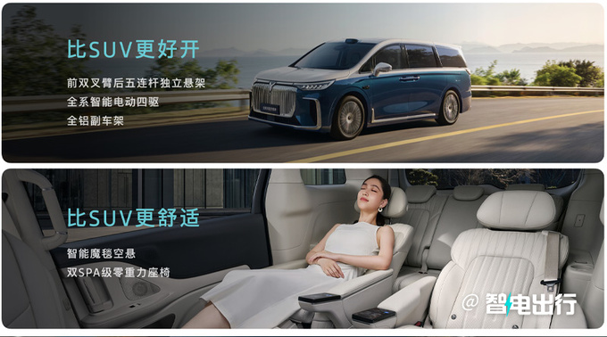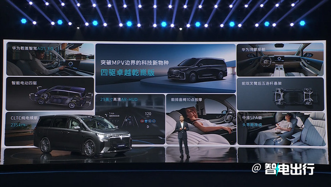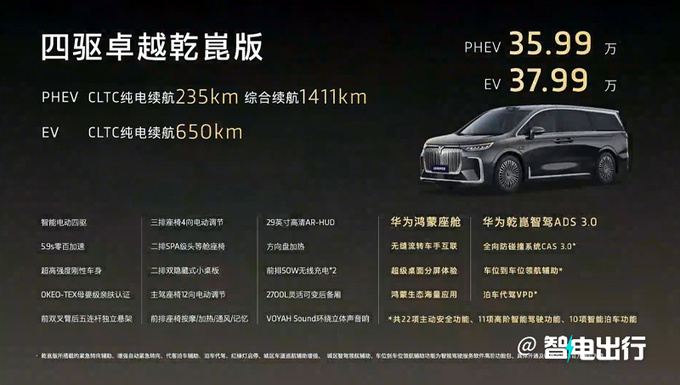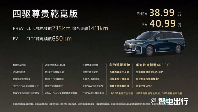 新梦想家卓越/尊贵乾崑版标配智能四驱系统+全铝副车架,PHEV版发动机最大功率110kW,综合功率420kW,匹配41.7kWh电池,CLTC纯电续航235km,综合续航1411km;EV版综合功率320kW,CLTC纯电续航650km。