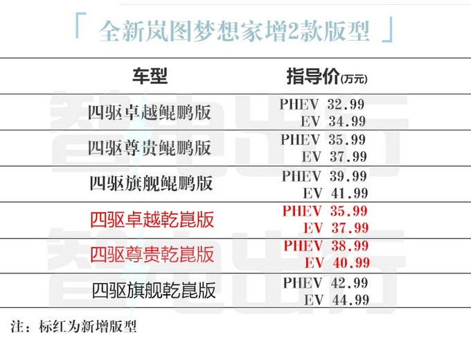 2月19日,新岚图梦想家四驱卓越乾崑版和四驱尊贵乾崑版上市,PHEV版售价分别为35.99万元和38.99万元;EV版售价分别为37.99万元和40.99万元,起售价比四驱旗舰乾崑版(原有版型)便宜7万。上市首销期限时可享至高6.8万元权益,岚图品牌车主置换乾崑版可享高阶智驾包3万元优惠。