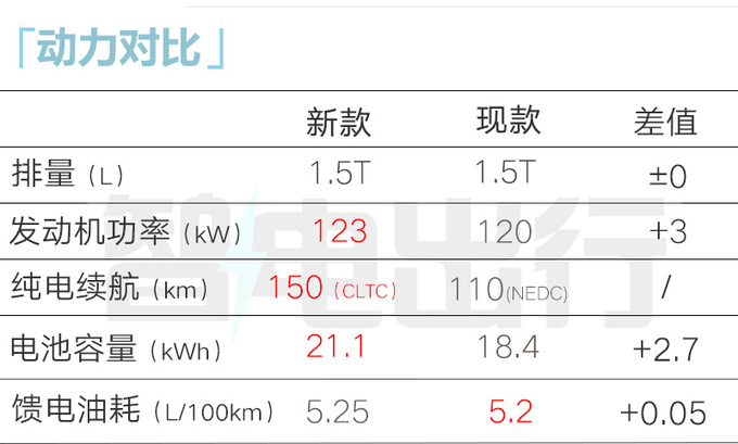 新车搭载1.5T插混系统,发动机功率较现款增加3kW,匹配10.6/21.1kWh电池组,百公里馈电油耗5.1/5.25L。