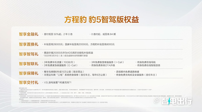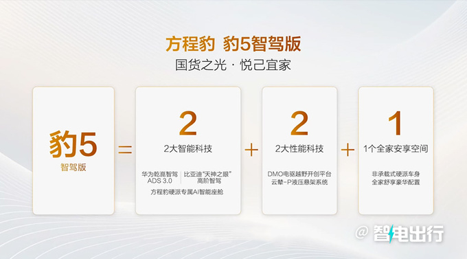 豹5智驾版延续非承载式硬派车身,天神智驾版搭载比亚迪“天神之眼”高阶智驾;激光乾崑版搭载华为乾崑智驾ADS 3.0,可实现车位到车位全场景贯通。还配备AI智能座舱、DMO电驱越野开创平台、云辇-P液压悬架系统等。