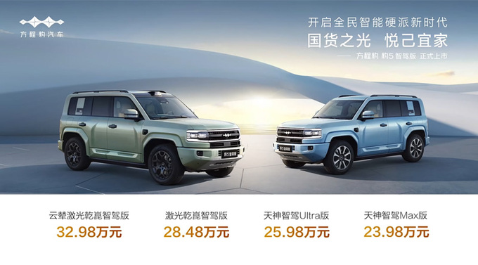 2月21日,豹5智驾版上市,共4款版型,售价与老款一致,天神智驾版售价分别为23.98万元和25.98万元;激光乾崑智驾版售价分别为28.48万元和32.98万元。