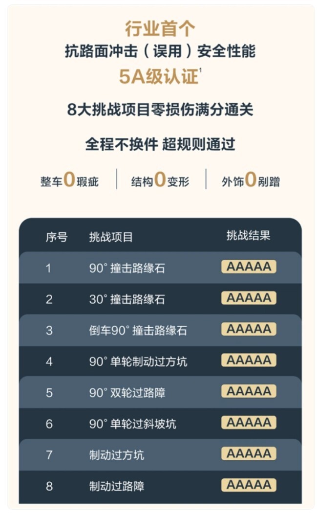 问界M5在此次测试中表现出色,在90°撞击路缘石、90°单轮制动过方坑等8大挑战项目中,实现了全程不换件,超规则通过,零损伤满分通关。整车0瑕疵、结构0变形、外饰0剐蹭,获得5A级认证成绩单。此项测试表明,问界M5具备降低90%误用工况损伤风险能力,有效避免意外损伤造成的高额维修费用,更安全、更省钱。