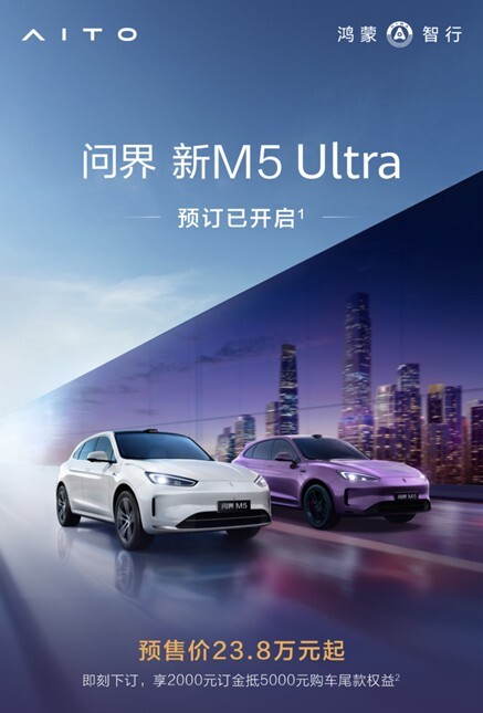目前,问界新M5 Ultra已开启预订,预售价23.8万元起。即刻下订,用户可享2000元订金抵5000元购车尾款权益。作为高颜都市智能SUV,问界新M5 Ultra实现了五大产品力升级,集“惊艳颜值、卓越驾控、领先智驾、全面安全、豪华座舱”五大核心优势于一身,旨在为年轻家庭及都市精英带来更智能、更安全、更具品质感的出行体验。