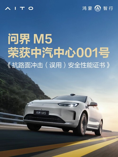 3月3日,问界M5安全性能再添官方认证,获中汽中心颁发的001号《抗路面冲击(误用)安全性能证书》,问界M5也是行业首个获得“抗路面冲击(误用)安全性能5A级认证”的新能源车型。问界M5自发布以来,凭借ADS3.0高阶智驾、鸿蒙4.0智能座舱、笼式安全车身、百万豪车级的全铝合金底盘凝聚的超级产品力,成为国民出行市场宠儿。特别在用户最关注的安全性能方面,问界M5始终表现卓越,被市场誉为“陆地小坦克”。
