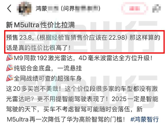 现款虽然标配智驾,但雷达配置一般,城区复杂道路偶尔“犯懵”。新M5 Ultra全系升级192线激光雷达+4D毫米波雷达,扫描精度翻倍,连静止物体都能精准识别。搭载的华为乾崑ADS 3.0高阶智驾支持“边刹边让”功能,紧急情况自动转向避险。
