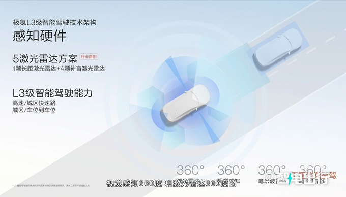 极氪L3级智能驾驶技术架构采用5个激光雷达的布置方案,包括1个长距激光雷达和4个Dtof补盲激光雷达,不仅可做到高速和城市快速路的L3级智能驾驶,更为城区及车位到车位的L3级智能驾驶做好准备。