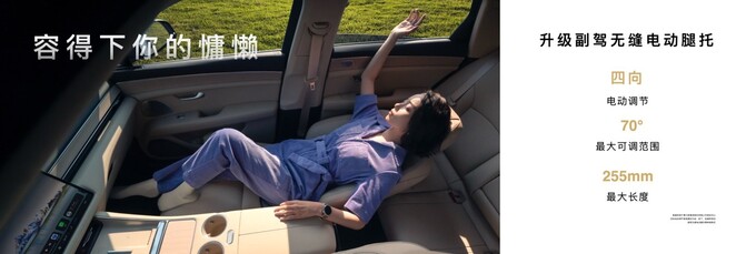 问界新M5 Ultra副驾升级无缝四向电动腿托,最大角度可达70°,最大长度255mm,搭配可调色温化妆镜,为副驾乘客打造专属舒适空间。全系标配舒云座椅,采用10层舒适性叠层设计,前排具备通风、加热、按摩功能,后排配备双HUAWEI Maglink®,支持多设备联动。