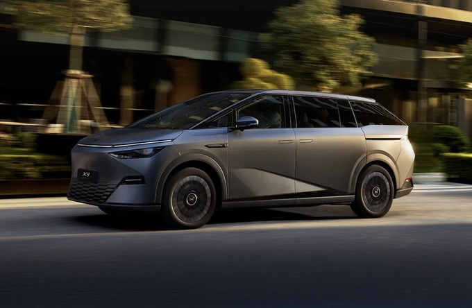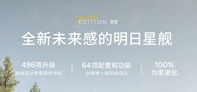 2025款X9提供单电机(235kW)与双电机(370kW)版本,均支持磷酸铁锂或三元锂电池选项。四驱版新增磷酸铁锂电池,CLTC续航最高740km,0-100km/h加速5.7秒,极速200km/h。悬架支持90mm调节范围,兼顾舒适与通过性。