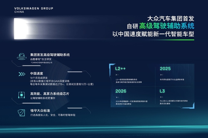 中国速度,本土研发——由集团中国团队研发,专为中国复杂多样的路况量身打造的高级驾驶辅助系统首次亮相。依托高效能、高算力的系统级芯片(SoC),经由酷睿程自有AI数据工程平台GAIA充分训练,该系统可最高实现L2++级别高级驾驶辅助功能,支持用户快速应对各种复杂路况。该系统将在今年率先搭载于一款面向中国市场的大众品牌新车型,并计划于2026年进一步应用到基于CMP平台开发、搭载CEA电子电气架构(China Electronic Architecture)的全新智能网联车型,满足更多主流紧凑型细分市场消费者的需求。