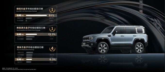BJ40增程既能城市通勤非常省油、又能周末户外肆意驰骋,发布会后1小时订单量就突破了3000台,48小时突破了1万台。根据中汽中心周度上险数显示,在增程方盒子排行榜上,BJ40增程上周市场份额达到81%;在新能源方盒子市场,排名第一;在整体方盒子市场中,排名第四。这是用户对北京越野“做增程方盒子之王”的信任投票。