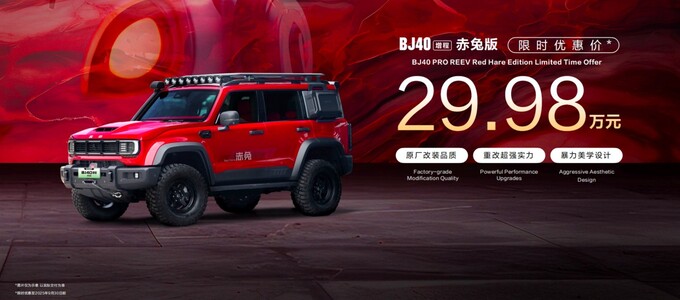 上市以来,BJ40增程进阶版订单比例超过75%。北京越野董事长王昊宣布,BJ40增程赤兔版正式发布,实现颜值、性能、安全三大升级,大幅提升整车视觉冲击力、越野性能以及安全防护,改装提升项价值超20万元,限时优惠价为29.98万元(截止至9月30日),即刻可在“悦野圈APP”下单预存2000元创始基金,预计今年四季度正式交付。