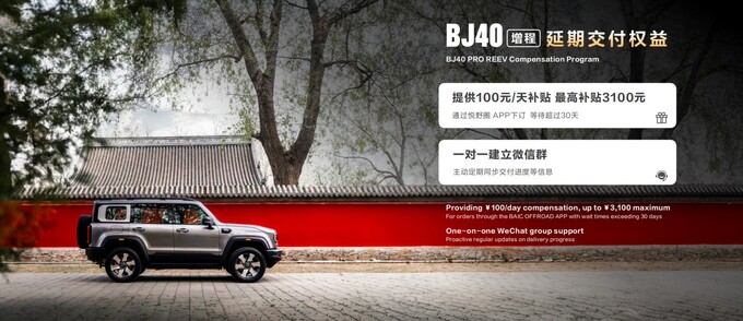 短时间大量订单涌入,市场上存在部分车辆订单延迟交付。北京越野发布“BJ40增程延期交付权益”,用户在悦野圈 APP 下订后,车辆等待时间超过 30 天后给予 100 元/天补贴,最高补贴 3100 元,补贴将在悦野圈 APP 以“积分”形式兑现给用户。同时,北京越野将与用户一对一建立微信群,主动定期同步车辆生产下线进度、物流发运进度及预计交车时间等,让用户的期待离实现越来越近。