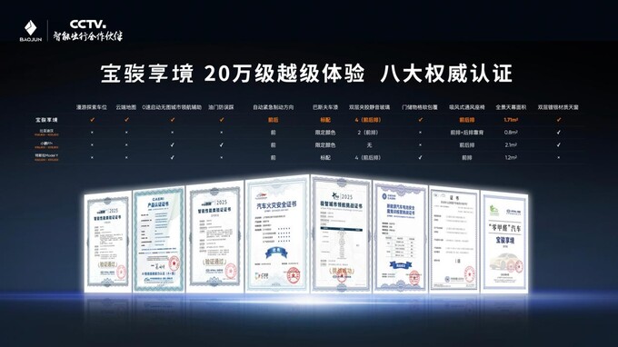 宝骏享境以硬核品质赢得权威认可,先后获得由中汽中心、中国汽研、中国质量认证中心颁发的主动安全,汽车火灾安全等八大认证。同时,宝骏享境还荣获“中央广播电视总台2025年智能出行合作伙伴”称号、成为上海浪琴环球马术冠军赛的赛事贵宾车队专属用车。宝骏享境以全维实力,为用户打造超越期待的越级驾乘享受。