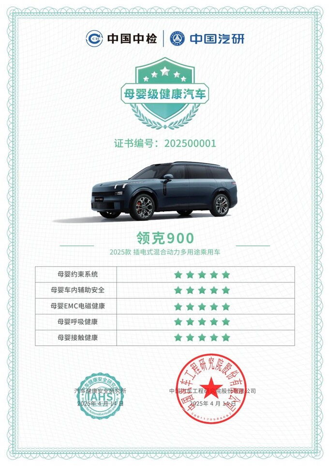 内饰选材上,领克900运用臻奢光织面料、星钻智控旋钮、水晶质感饰件及大量顶级Nappa真皮、仿麂皮等极致细节,尽显旗舰座驾的尊崇风范与舒适格调;座舱健康上,领克900荣获了行业首个“母婴级健康汽车”认证。其严选0沥青、0杂棉、0有害溶剂用料的“三0”座舱,5A牙胶级健康座椅面料,以及抗菌率超过99%的母婴级内饰材料,让家人的每一次触碰都安全舒心。