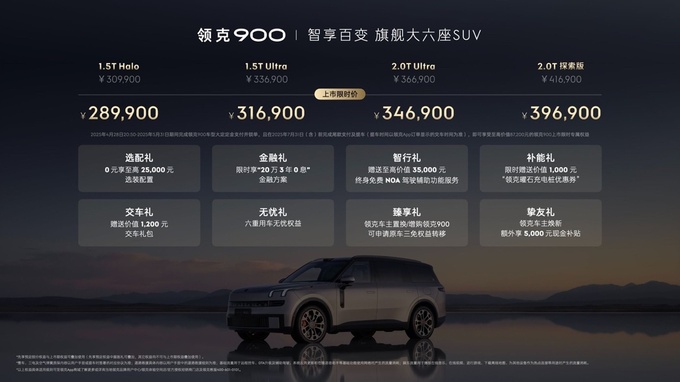 2025年4月28日,领克汽车旗下全新旗舰力作领克900正式上市,推出1.5T Halo、1.5T Ultra、2.0T Ultra 、2.0T探索版四大配置,限时售价28.99万元至39.69万元。