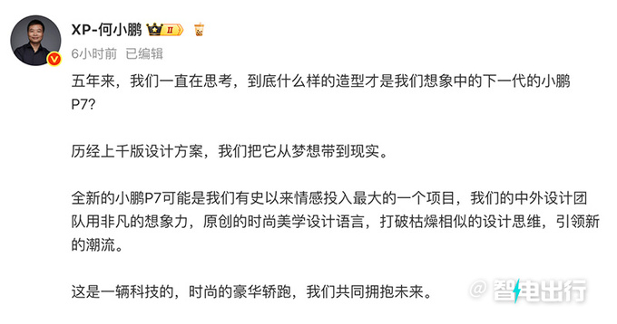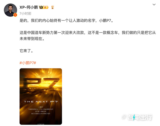 今天早上,何小鹏直接在社交媒体上表示:我们的内心始终有一个让人激动的名字,小鹏P7,是中国造车新势力第一次迎来大改款,我们只是把它从未来带到现在。