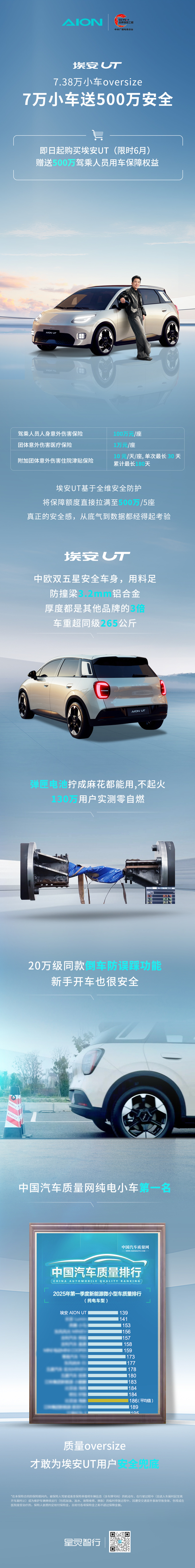 埃安UT以7万级的定位,构建了涵盖被动安全结构、电池本质安全、主动安全防护与整车可靠品质的立体防护体系,这份对安全的极致追求,成为品牌敢于推出500万天价保单的深层逻辑。从源头上降低安全事故的概率,再用500万天价保单把安全保障拉满,埃安UT小车尺寸,也能给到乘客足够大的安全。