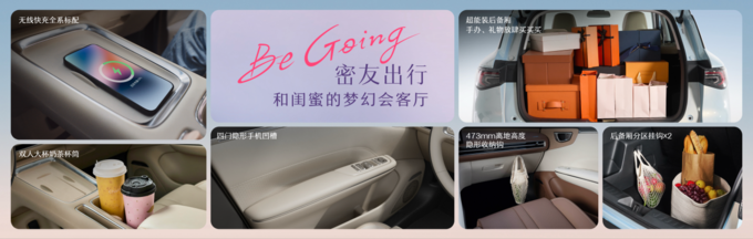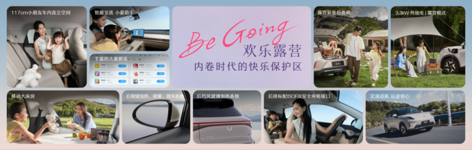 对于喜爱露营的用户,缤果S提供3.3kW外放电功能,开启露营模式后锁车不下电,走动不误触。1450L下沉式后备厢适配0-10岁童车,轻松收纳所有装备;后排放平后即可形成移动大床房,休憩更自在;车机自带丰富儿童娱乐应用,儿歌、动画片应有尽有,更有能说会道的小菱助手,陪小朋友聊天、讲故事,让旅途充满欢声笑语。同时,用户可开启定速巡航功能,远途更省心;后视镜及后挡风玻璃均配备加热功能,保证雨雪天气行车安全;锁车后后视镜自动折叠,有效防止左右剐蹭。