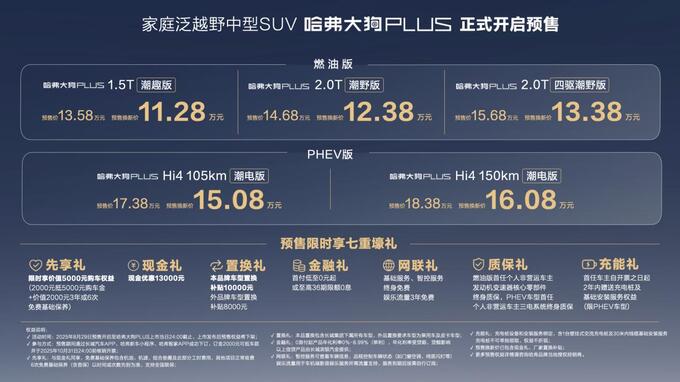 作为哈弗展台的重磅“c位”产品,“为家而来”的哈弗大狗PLUS正式发布预售,现在下订可享受13000元现金优惠,至高10000元置换补贴,预售换新价格11.28万元至16.08万元。其中,哈弗大狗PLUS:1.5T潮趣版11.28万元、2.0T潮野版12.38万元、2.0T四驱潮野版13.38万元。哈弗大狗PLUS PHEV:Hi4 105km潮电版15.08万元、Hi4 150km 潮电版16.08万元。此外,更有先享礼、金融礼、网联礼、质保礼、充能礼可享,包括: