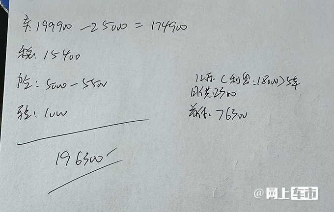 销售:指导价是19.99万,减去2.5万优惠后,裸车价就是17.49万。购置税大概是15400元,验车费用1000元,保险大概5000元。