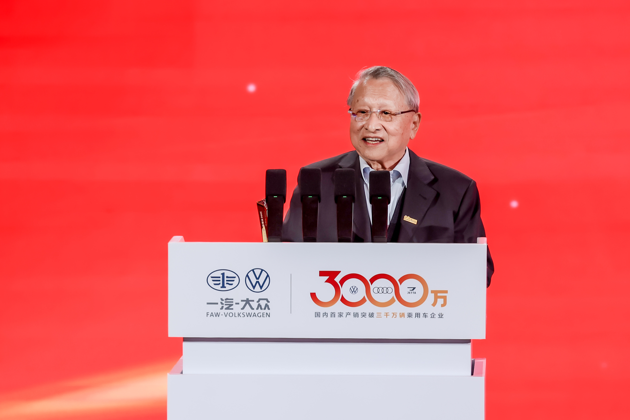 林敢为在发言中深情回顾了企业从合资筹建到稳健发展的奋斗历程,回忆了企业从无到有、由小到大的艰辛与荣耀,为见证企业跨越3000万辆的重要时刻感到欣慰和自豪,希望一汽-大众在新的起点实现新的突破、创造新的辉煌。
