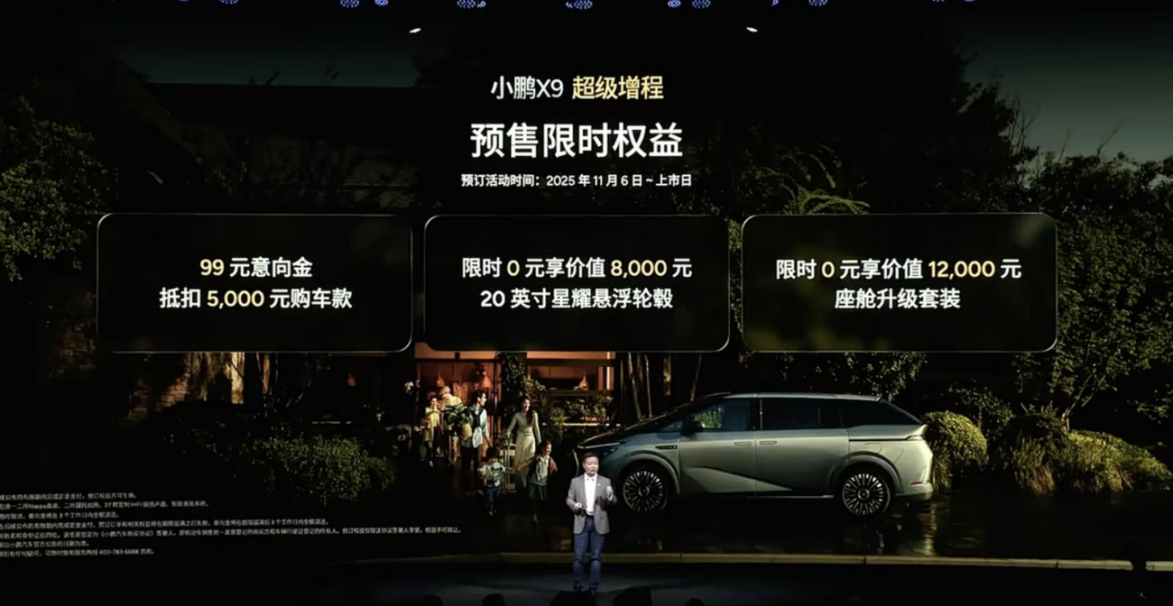 2025年11月6日,小鹏X9超级增程开启预售。新车推出Max和Ultra两个版本,预售价格分别为35万元和37万元,预订可享受99元意向金抵扣5000元购车金、限时0元享价值8000元20英寸星耀悬浮轮毂、限时0元享价值12000元座舱升级套装,权益即日起生效至新车上市日。小鹏X9超级增程作为全球续航最长大七座,CLTC纯电续航达452km,CLTC综合续航达1602km,引领小鹏汽车开启增程全新纪元。