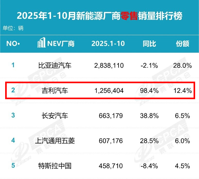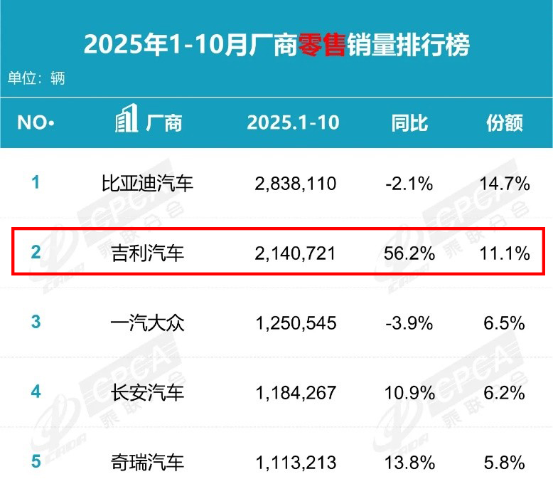 在2025年新能源汽车渗透率首破50%的行业拐点,吉利汽车交出了一份双线飘红的亮眼答卷。数据显示,1-10月吉利汽车总销量达214万辆,稳居行业第二,同比增速56.2%,较国内狭义乘用车市场8%的增速高出48个百分点,同时以超125万辆新能源销量位列细分市场第二,成为自主车企领跑行业的标杆。