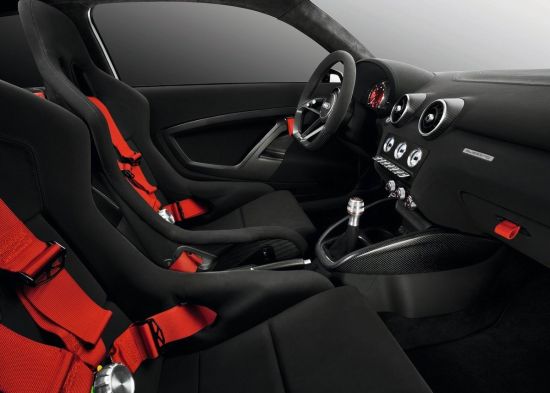 奥迪A1 Clubsport Quattro概念车 A1 Clubsport Quattro概念车仍然采用大众PQ25平台,但设计师对悬架系统进行了大幅改进和调校,并用19英寸合金轮毂配搭255/30 R19高性能轮胎,前轮为碳纤维陶瓷制动碟配六活塞制动卡钳。座舱的设计没有辜负A1 Clubsport Quattro之名,奥迪扔掉后排座椅降低整备质量,上部加入碳纤维横梁增强车身刚性,下部则搁放两个赛车头盔。前排换上R8 GT的碳纤维桶型座椅配搭四点式安全带,新设计的平底方向盘使用碳纤维和反皮材质,碳纤维装饰板的大量使用也进一步提升了车厢内的运动氛围。