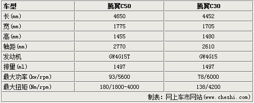 腾翼C50长4650mm、宽1775mm、高1455mm,轴距2770mm,相比腾翼C30要大不少,无论是长度还是轴距,不过车高要小一些让腾翼C50看起来更加的修长。另外,腾翼C50将搭载1.5T涡轮增压发动机,最大功率93千瓦,最大扭矩180牛米,虽然与合资品牌增压发动机有些差距,但毕竟是自主研发的值得肯定。