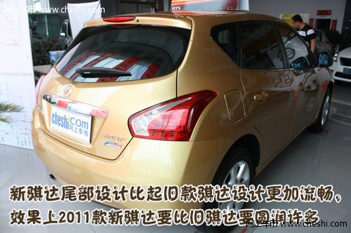 2011款新骐达尾部设计比起旧款骐达设计更加流畅,效果上2011款新骐达要比旧骐达要圆润许多。镀铬的后饰条替代了旧款外露的后门拉手,在提高车辆的档次的同时也符合时下车辆设计的潮流。高位刹车灯与全新设计尾灯为2011款新骐达在夜间构建一个安全的尾部警示灯组。