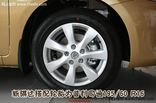 2011款新骐达搭配轮胎为普利司通195/60 R16,与旧款的全系配备185/65 R15相比要大一寸,更偏重车辆的舒适性。2011款新骐达的轮胎根据不同的排量车型用不同的尺寸,据上海车展 展出1.6T采用205/50 R17。