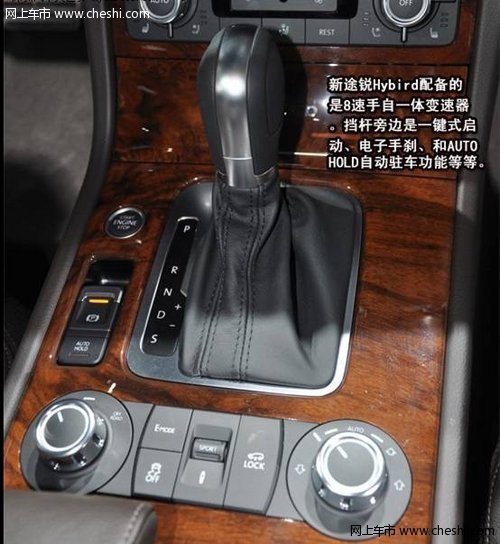新途锐Hybird配备的是8速手自一体变速器。挡杆旁边是一键式启动、电子手刹、和AUTOHOLD自动驻车功能等等。