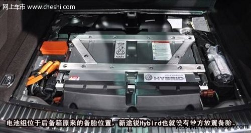 电池组位于后备箱原来的备胎位置,新途锐Hybird也就没有地方放置备胎。蓄电池组的额定电压为288伏特,能够产生1.7千瓦时的能量,最高输出功率为38kw。蓄电池中存储的能量,在纯电动模式下,可以支持新途锐Hybird行驶大约2公里,最高车速为50km/h。