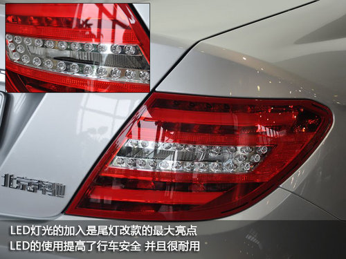 LED技术的运用在此次改款奔驰终于将这项技术运用到新车C级上,后尾的改变也主要体现在尾灯上。LED的尾灯红白相间,另外在后保险杠处增加了一条镀铬的装饰。