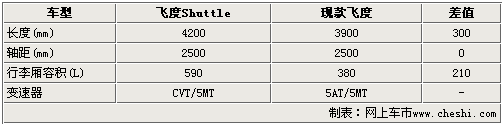 从车身尺寸来看,据了解飞度Shuttle车身长度上要比现款在售飞度长了300mm,达到4200mm,而轴距则叫现款毫无变化,为2500mm。在行李箱容积方面,飞度Shuttle将会有明显的增加,比现款飞度多了210L,相信这种表现会是其一大卖点。另外,发动机和现款飞度并无变化,变速器由CVT替代了5速自动变速器,进一步增强了换挡平顺性和燃油经济型。