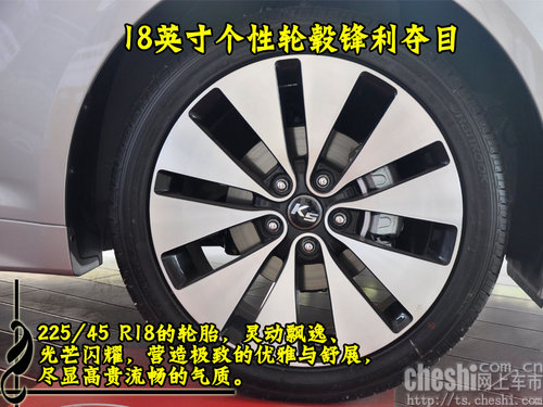 想必很多人对K5一个旋转的车轮的广告还印象深刻,那种“拉风”的感觉正是它轮毂的真实表达,18寸战斧式全抛光轮毂的确让人眼前一亮。套在上面的是来自韩泰的尺寸为225/45 R18的轮胎,与顶棚镀铬条相互辉映,灵动飘逸、光芒闪耀,营造极致的优雅与舒展,尽显高贵流畅的气质。