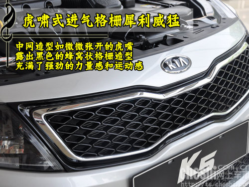 东风悦达起亚K5在外观首先让人识别的也正是她家族式的前脸。起亚家族式中网造型如微微张开的虎嘴,呲牙咧嘴,露出黑色的蜂窝状格栅造型,很有几分煞气,充满了强劲的力量感和运动感。